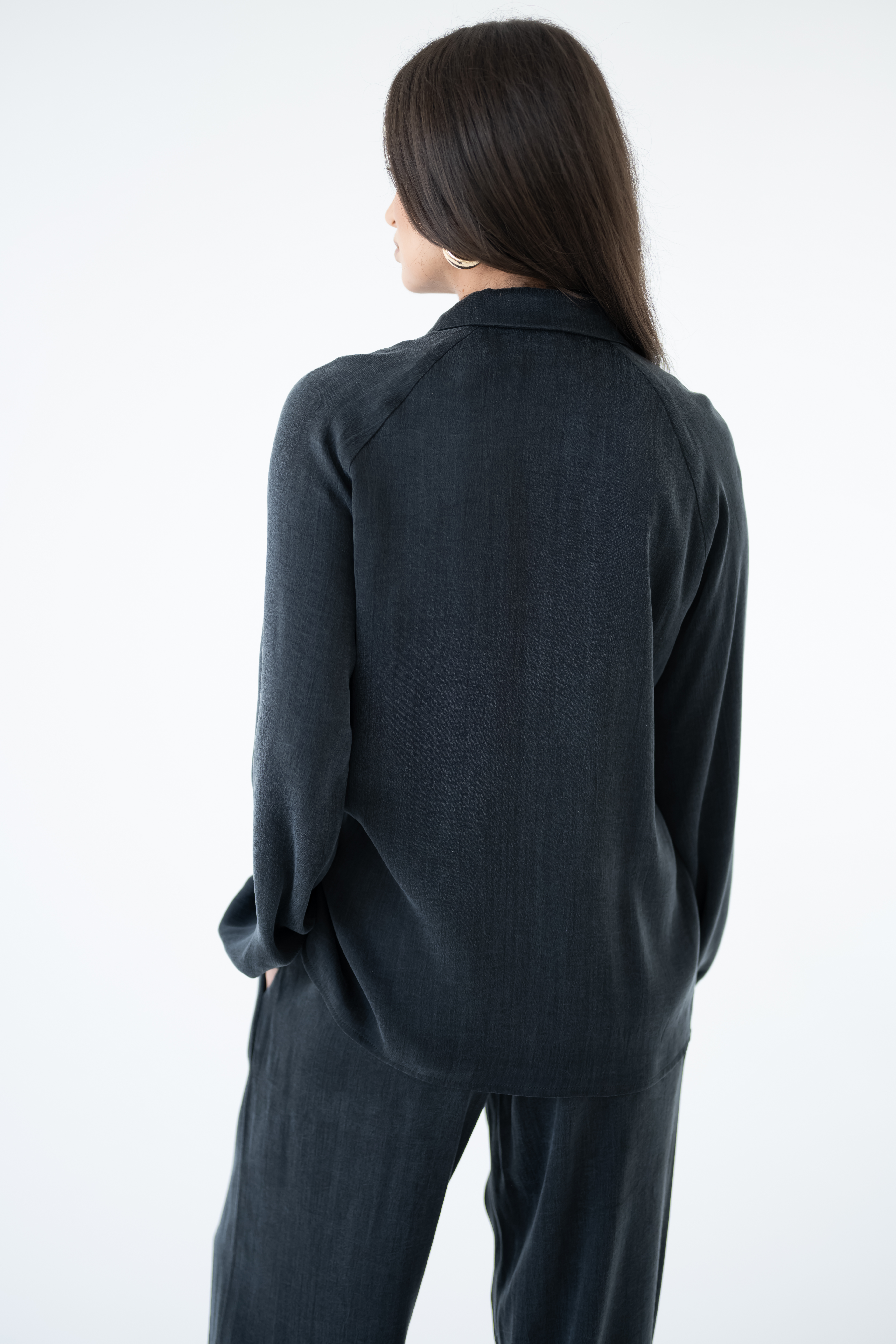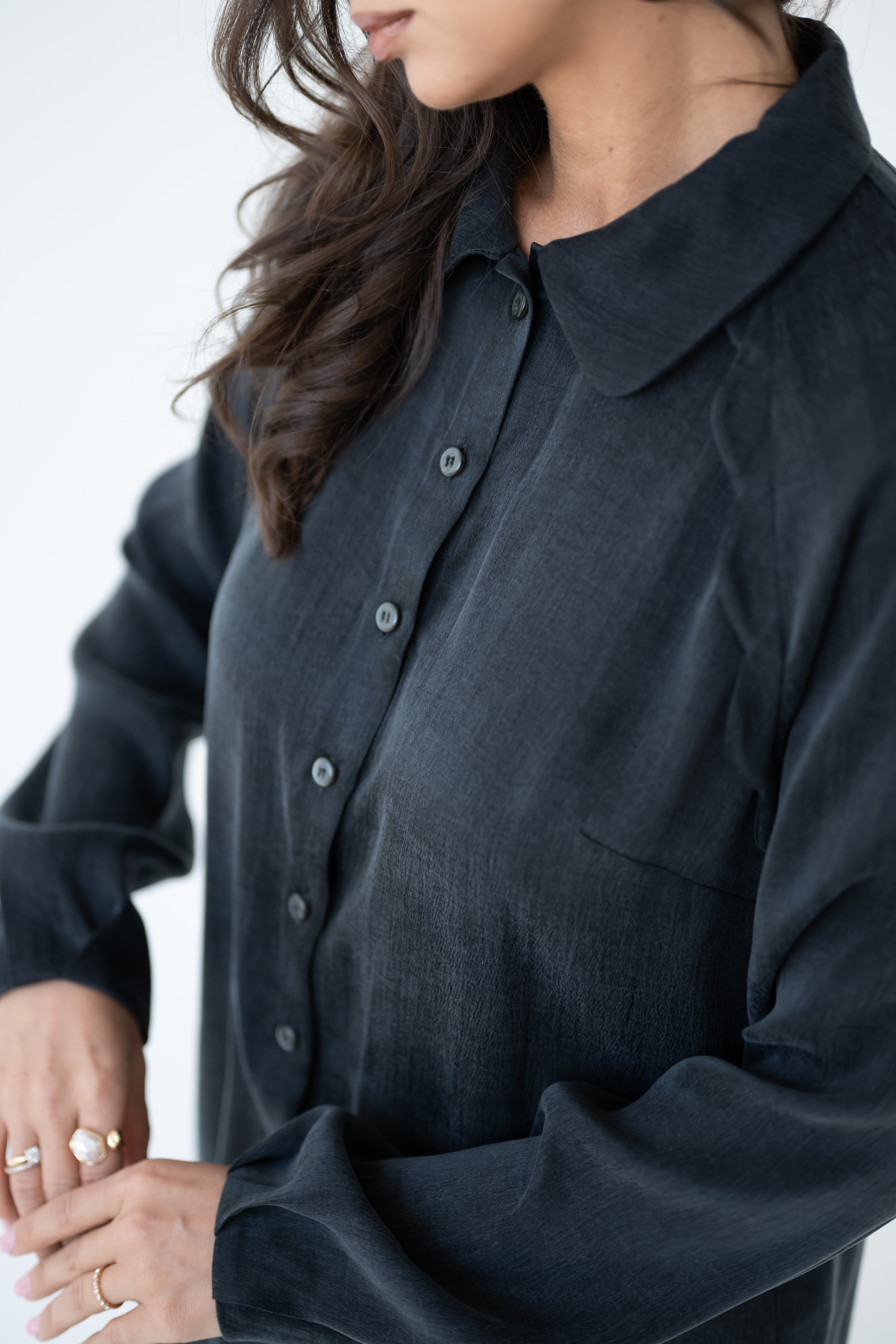 Niebanalne wykończenie rękawów przyciąga uwagę i podkreśla oryginalny styl koszuli. Dodatkowym akcentem jest efektowny detal w okolicy ramion, który nadaje całości charakteru i subtelnej elegancji. Okrągłe wykończenie kołnierzyka łagodzi formę i sprawia, że koszula prezentuje się lekko i nowocześnie. NOMI w klasycznym, czarnym kolorze, pięknie komponuje się z innymi elementami garderoby. Koszulę polecamy nosić w komplecie ze spodniami NOMA, tworząc spójny i stylowy zestaw idealny zarówno na co dzień, jak i na bardziej eleganckie okazje.