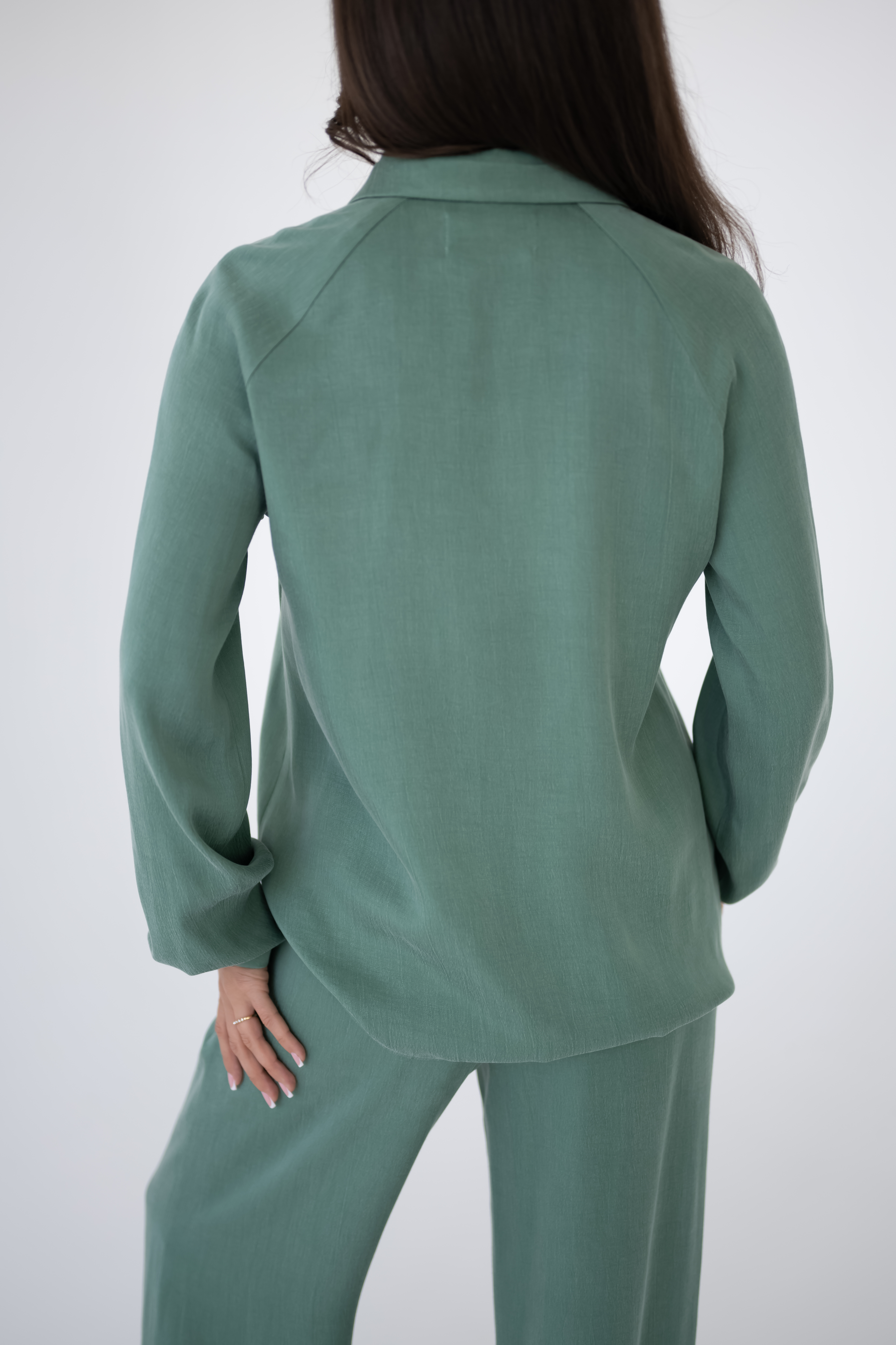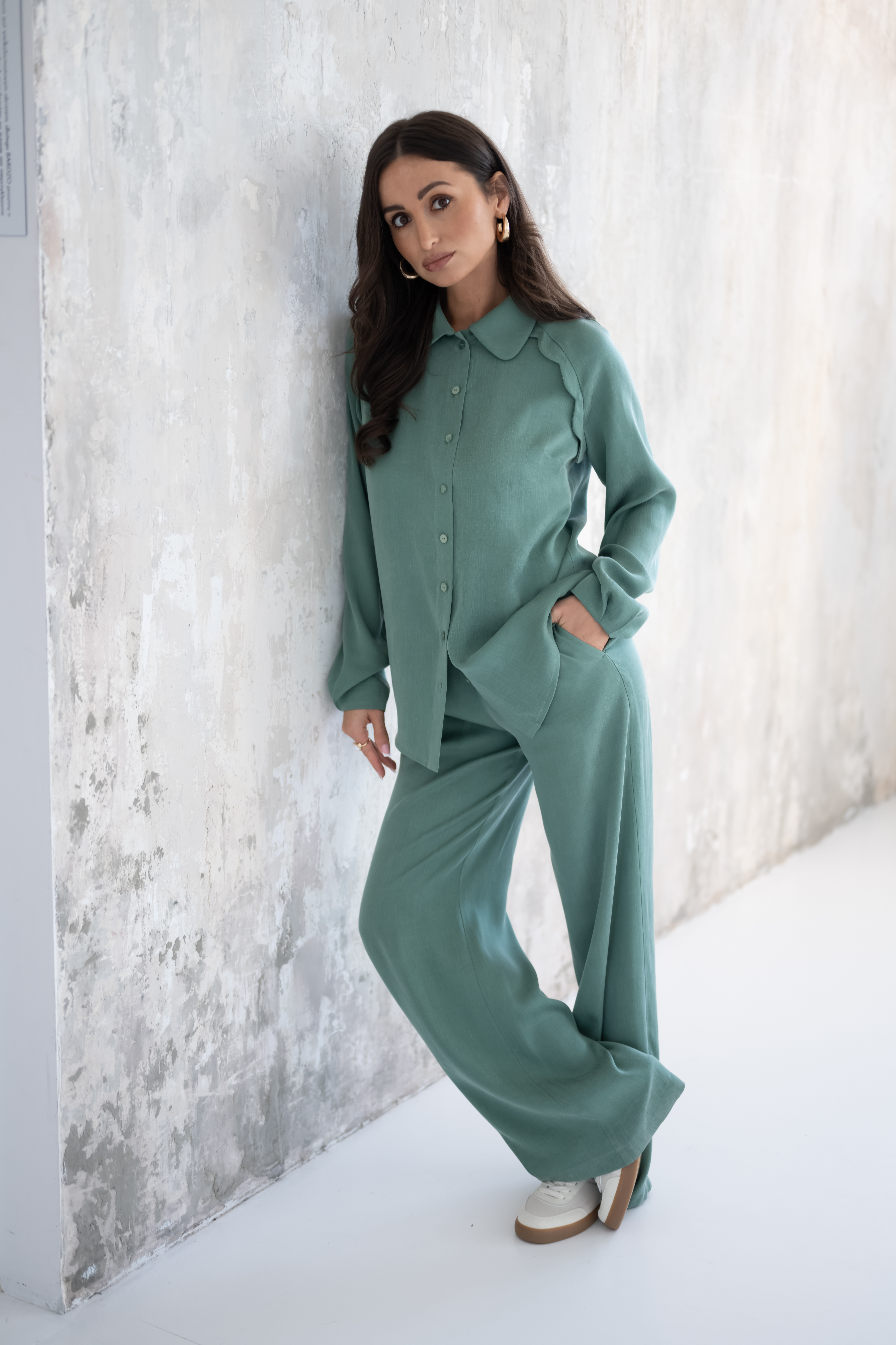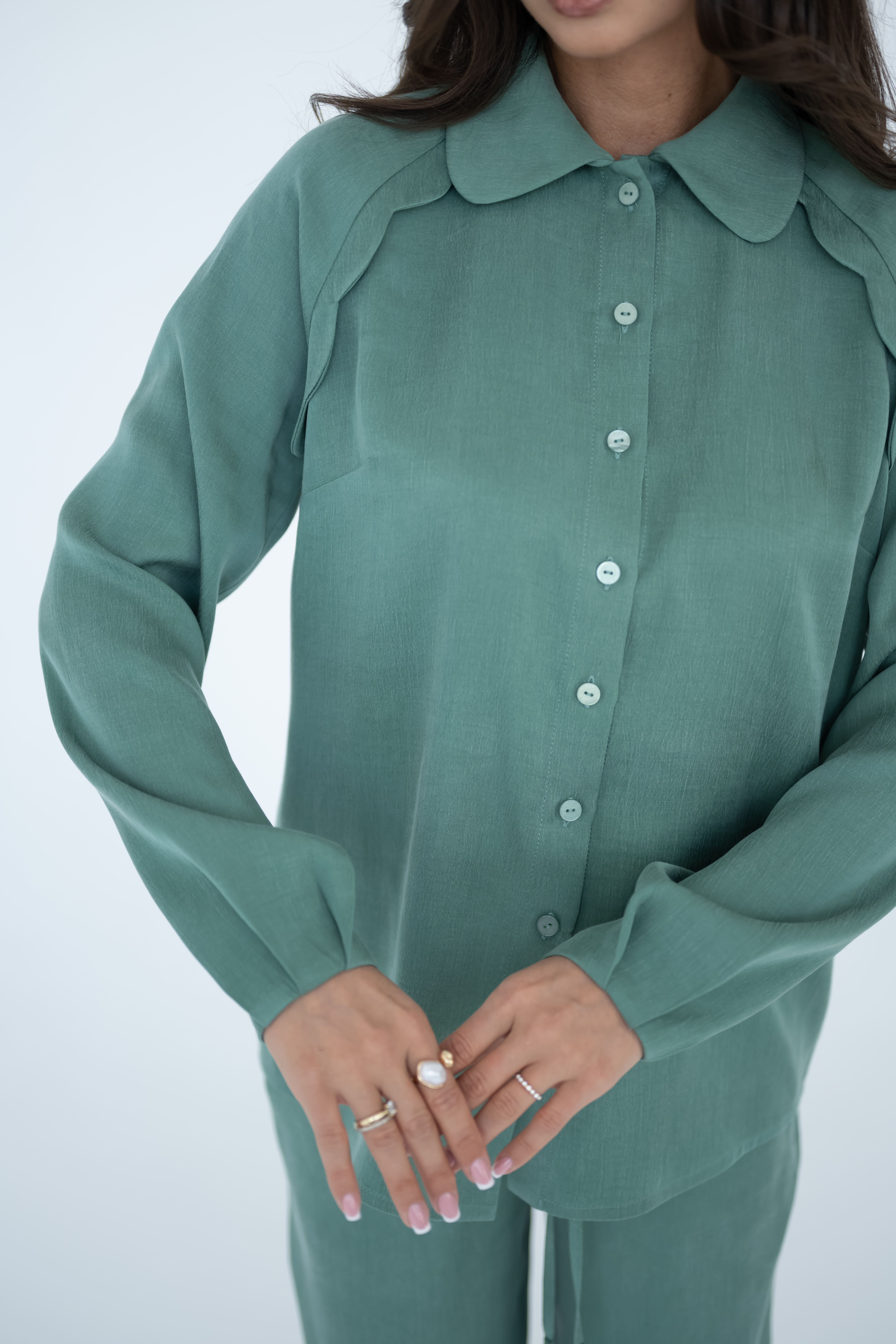 Niebanalne wykończenie rękawów przyciąga uwagę i podkreśla oryginalny styl koszuli. Dodatkowym akcentem jest efektowny detal w okolicy ramion, który nadaje całości charakteru i subtelnej elegancji. Okrągłe wykończenie kołnierzyka łagodzi formę i sprawia, że koszula prezentuje się lekko i nowocześnie. NOMI w szałwiowym odcieniu, który doskonale wpisuje się w aktualne trendy i pięknie komponuje się z innymi elementami garderoby. Koszulę polecamy nosić w komplecie ze spodniami NOMA, tworząc spójny i stylowy zestaw idealny zarówno na co dzień, jak i na bardziej eleganckie okazje.