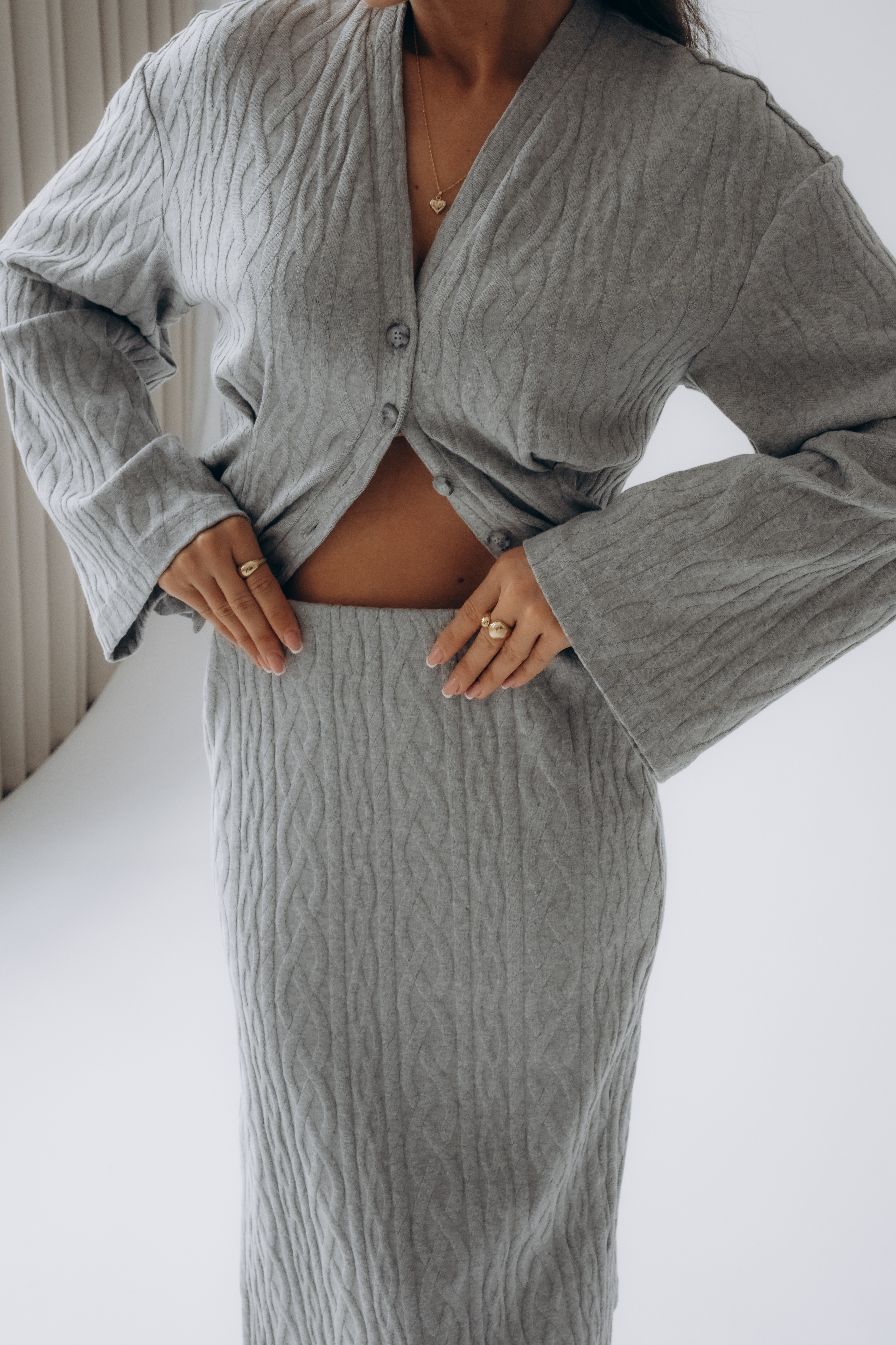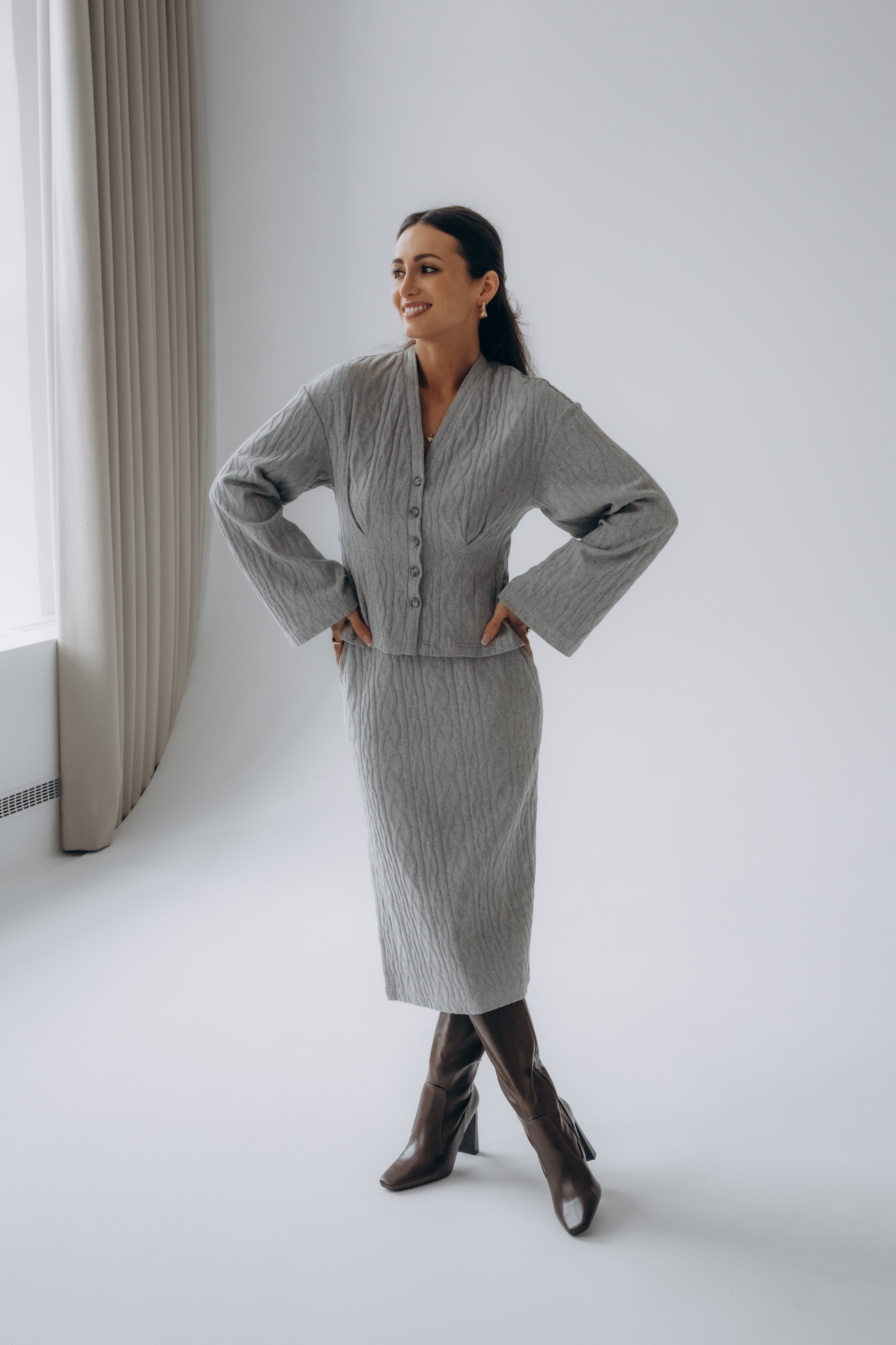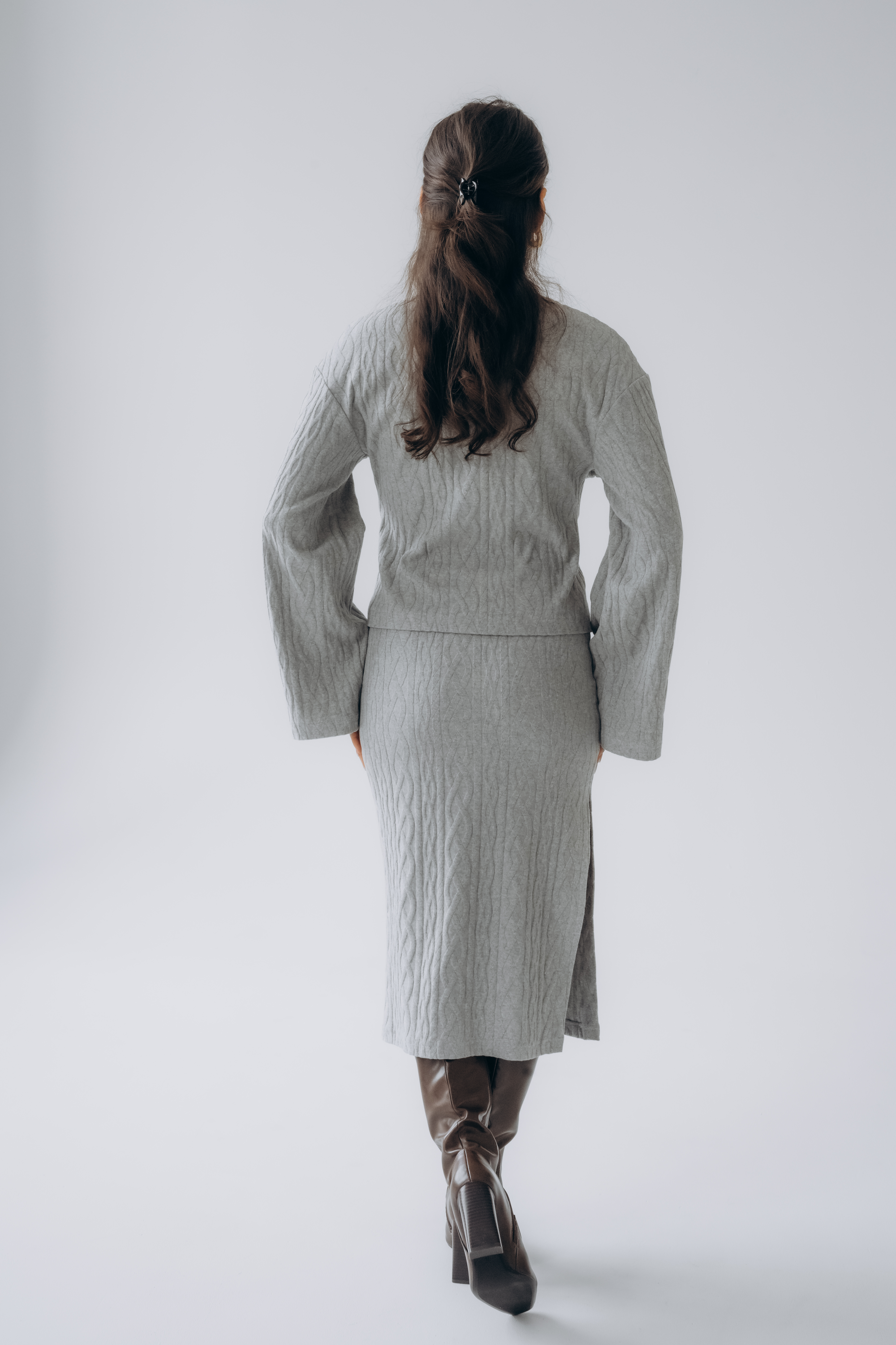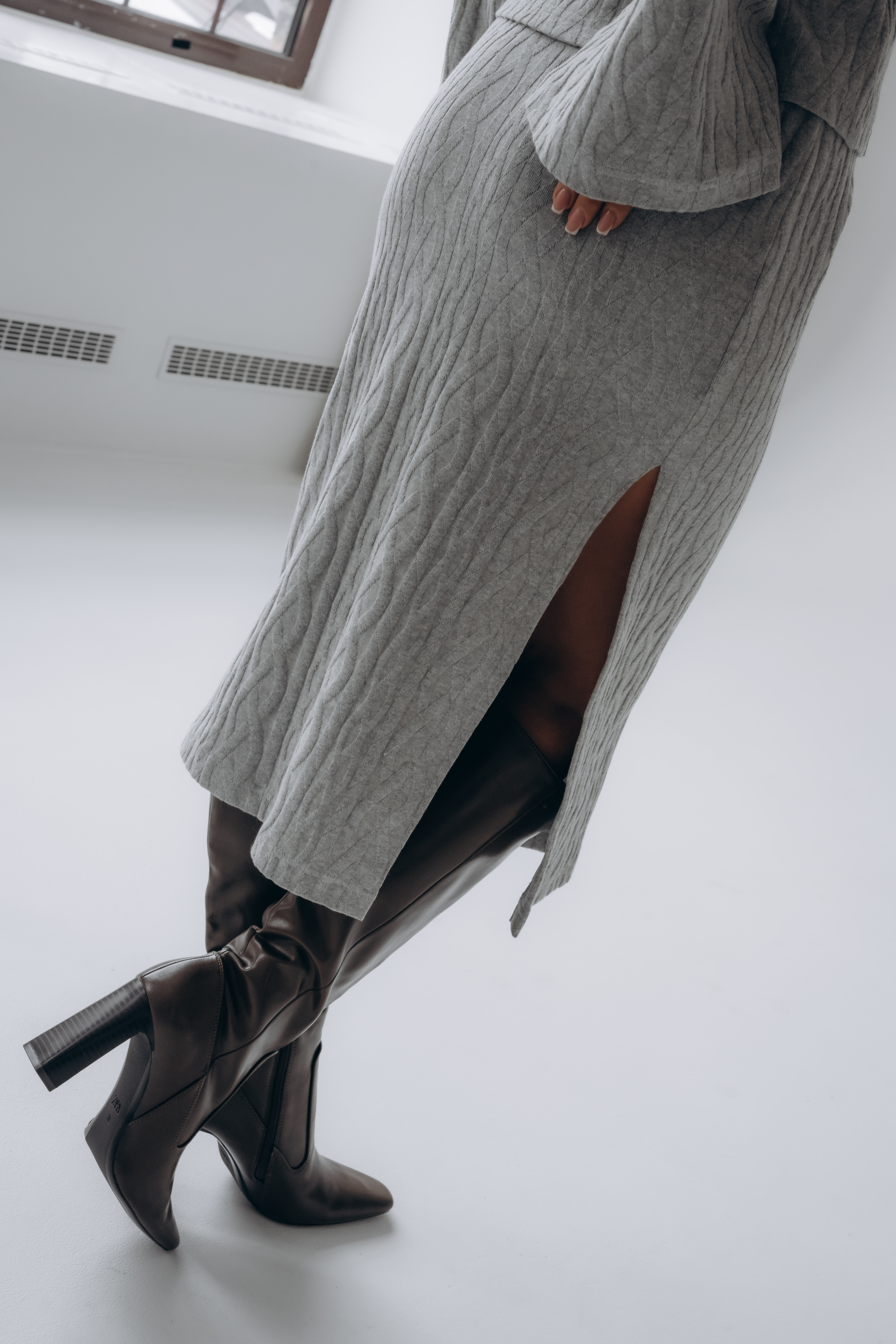 Ołówkowa spódnica o minimalistycznym charakterze, wykonana z miękkiej dzianiny bawełnianej, która zapewnia komfort noszenia i naturalną przewiewność. Elastyczny materiał delikatnie dopasowuje się do sylwetki, podkreślając jej kształt bez ograniczania swobody ruchu.