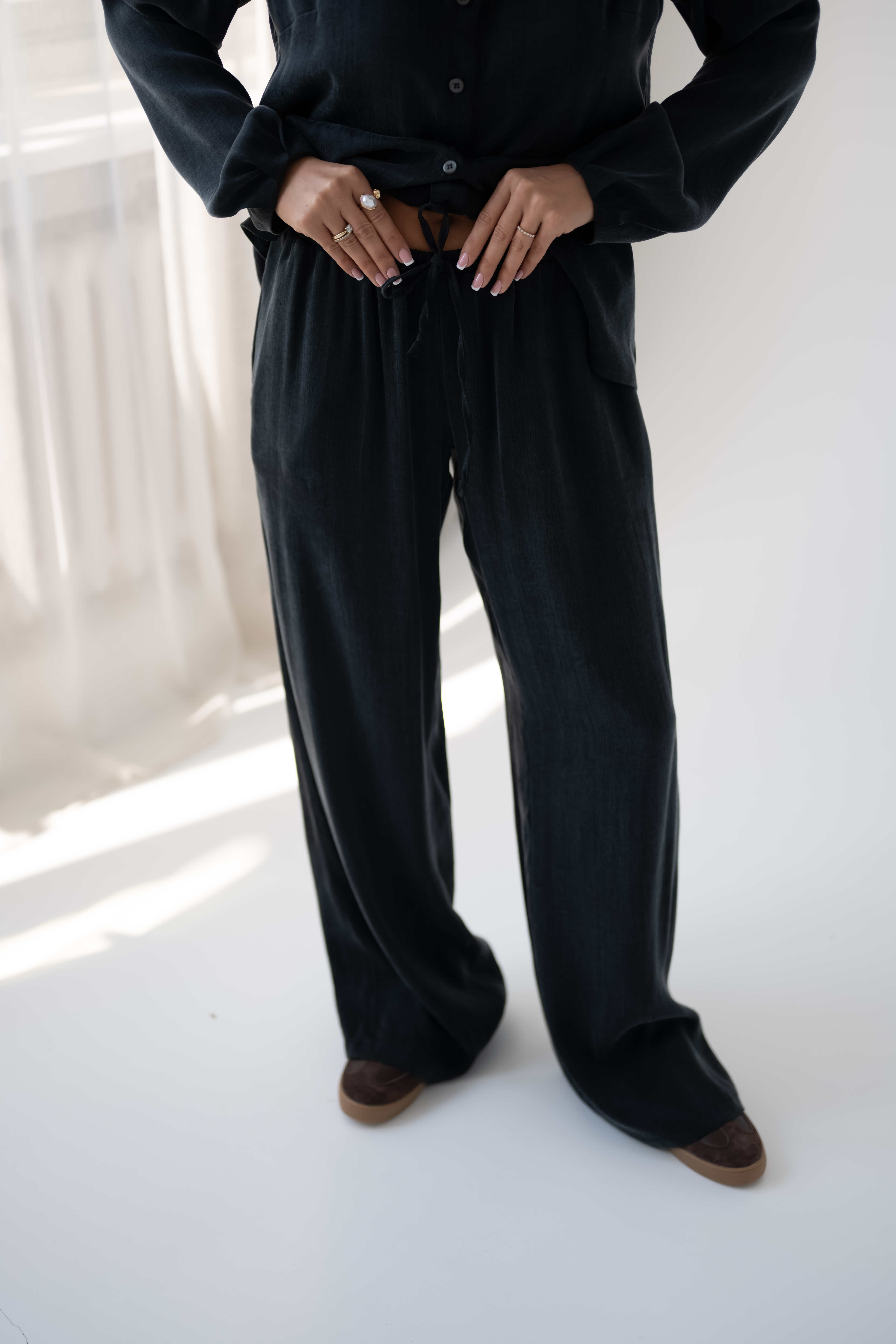 Elastyczna gumka w pasie w połączeniu z dodatkowym troczkiem umożliwia idealne dopasowanie, podkreślając wygodny, casualowy charakter spodni. Dwie praktyczne kieszenie dodają funkcjonalności, a klasyczny czarny kolor subtelną elegancję do każdej stylizacji. Spodnie doskonale komponują się w zestawie z koszulą NOMI Black, tworząc spójny i stylowy komplet – idealny zarówno na co dzień, jak i na bardziej casualowe wyjścia.