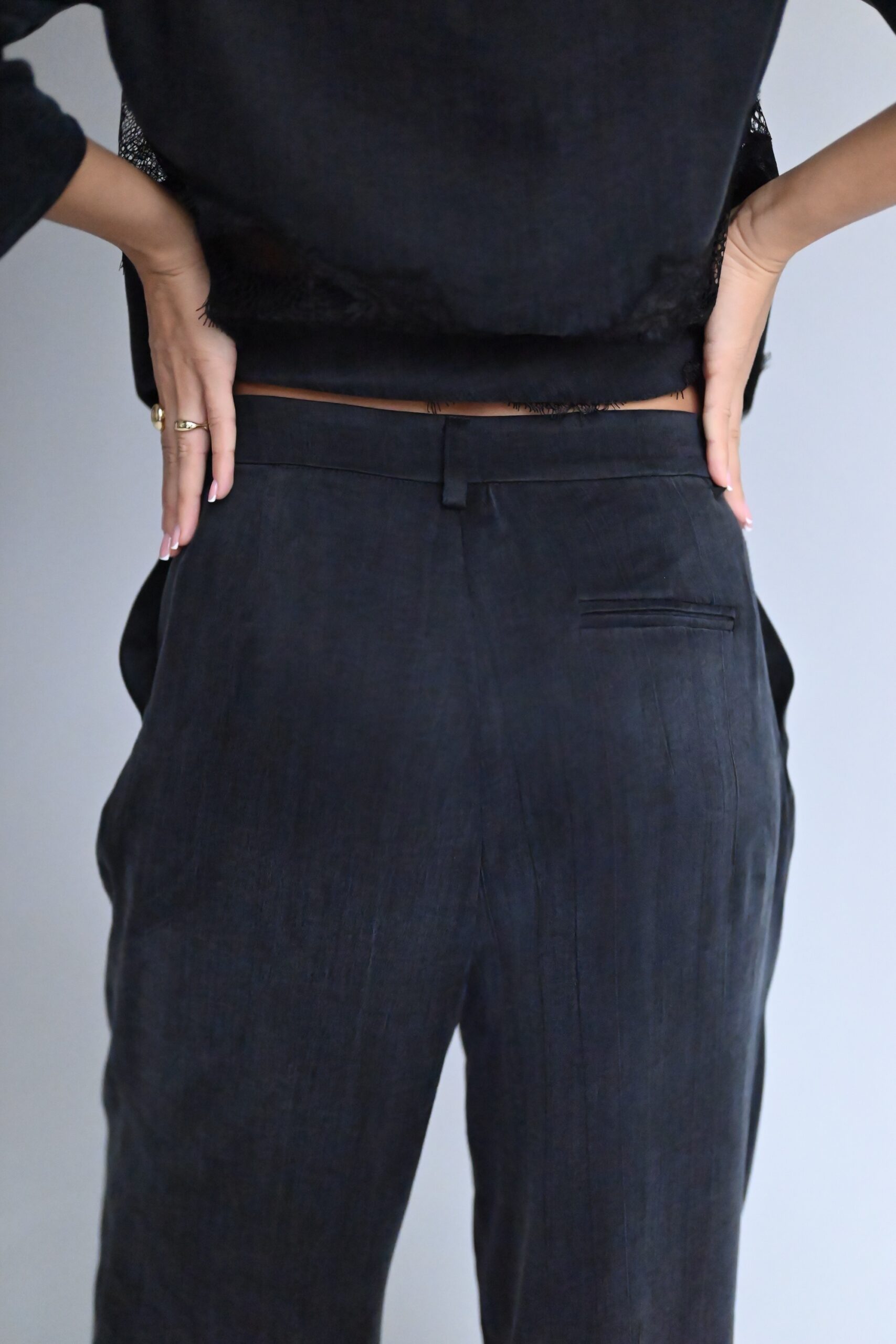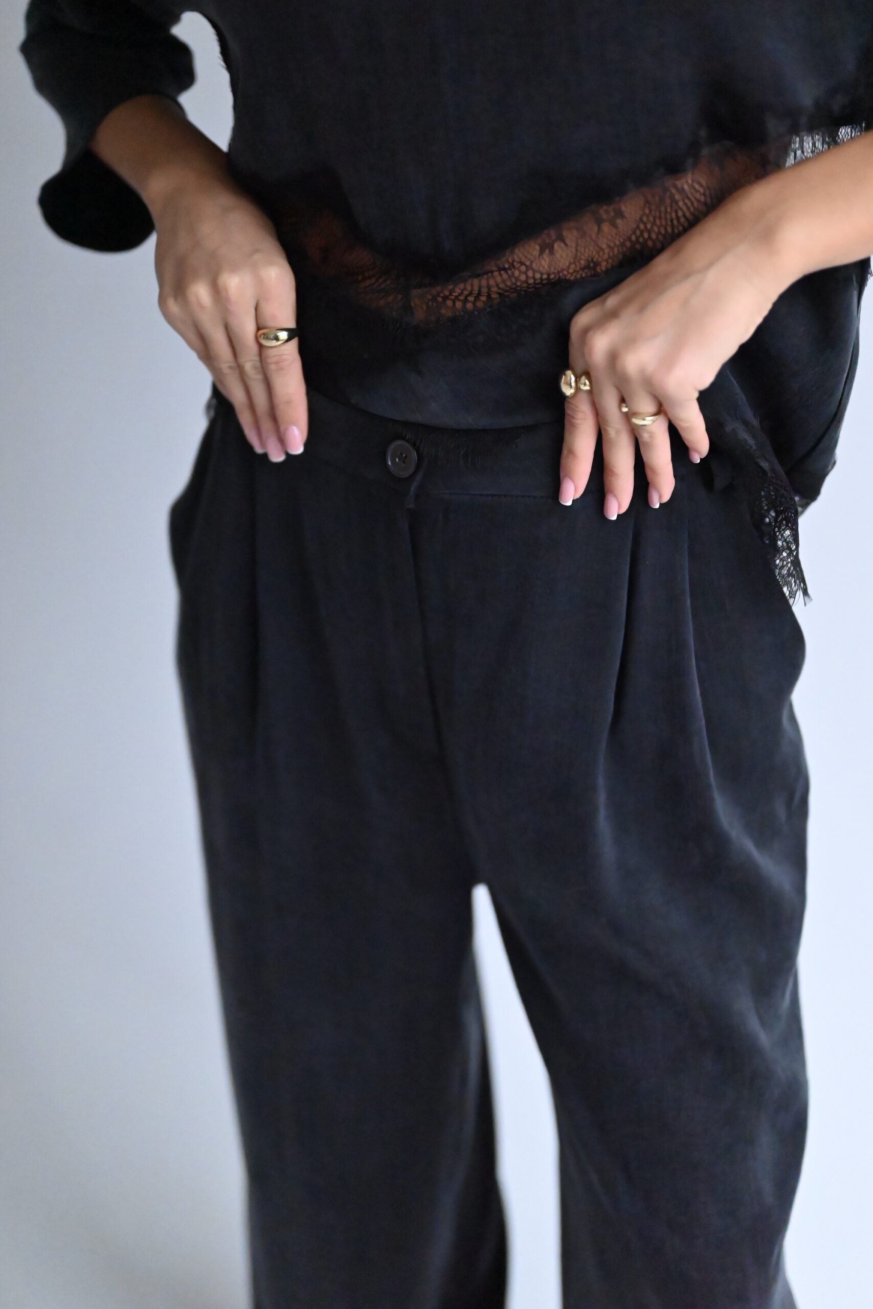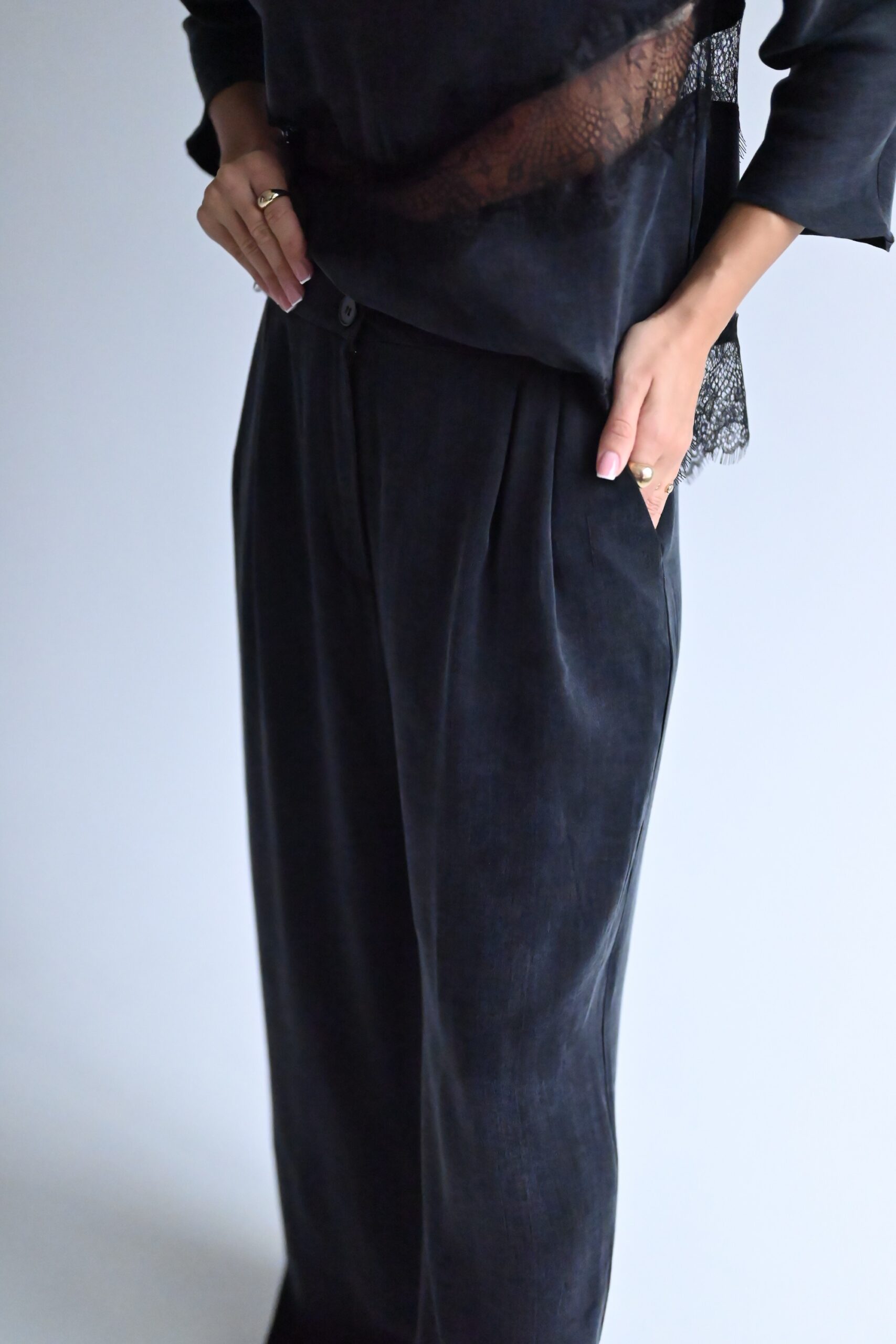 Minimalistyczne, wygodne i ponadczasowe. Stworzone z myślą o codziennej elegancji i pełnym komforcie noszenia. Podwyższony stan podkreśla talię i optycznie wydłuża sylwetkę. Zapinane na guzik, kieszenie po bokach zapewniają wygodę i funkcjonalność bez zaburzania minimalistycznej formy. Szerokie nogawki nadają spodniom nowoczesny charakter, pięknie pracują w ruchu i wysmuklają figurę. Ozdobne zakładki i szlufki, dzięki którym możesz nosić je z ulubionym paskiem. To spodnie, które łączą w sobie wygodę i wyrafinowanie. Idealne do codziennych stylizacji, pracy, spotkań i eleganckich wyjść. Świetnie komponują się z gładkimi bluzkami, dzianiną i minimalistycznymi koszulami.