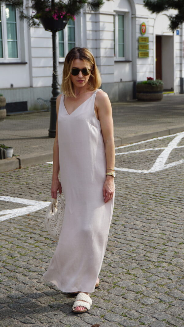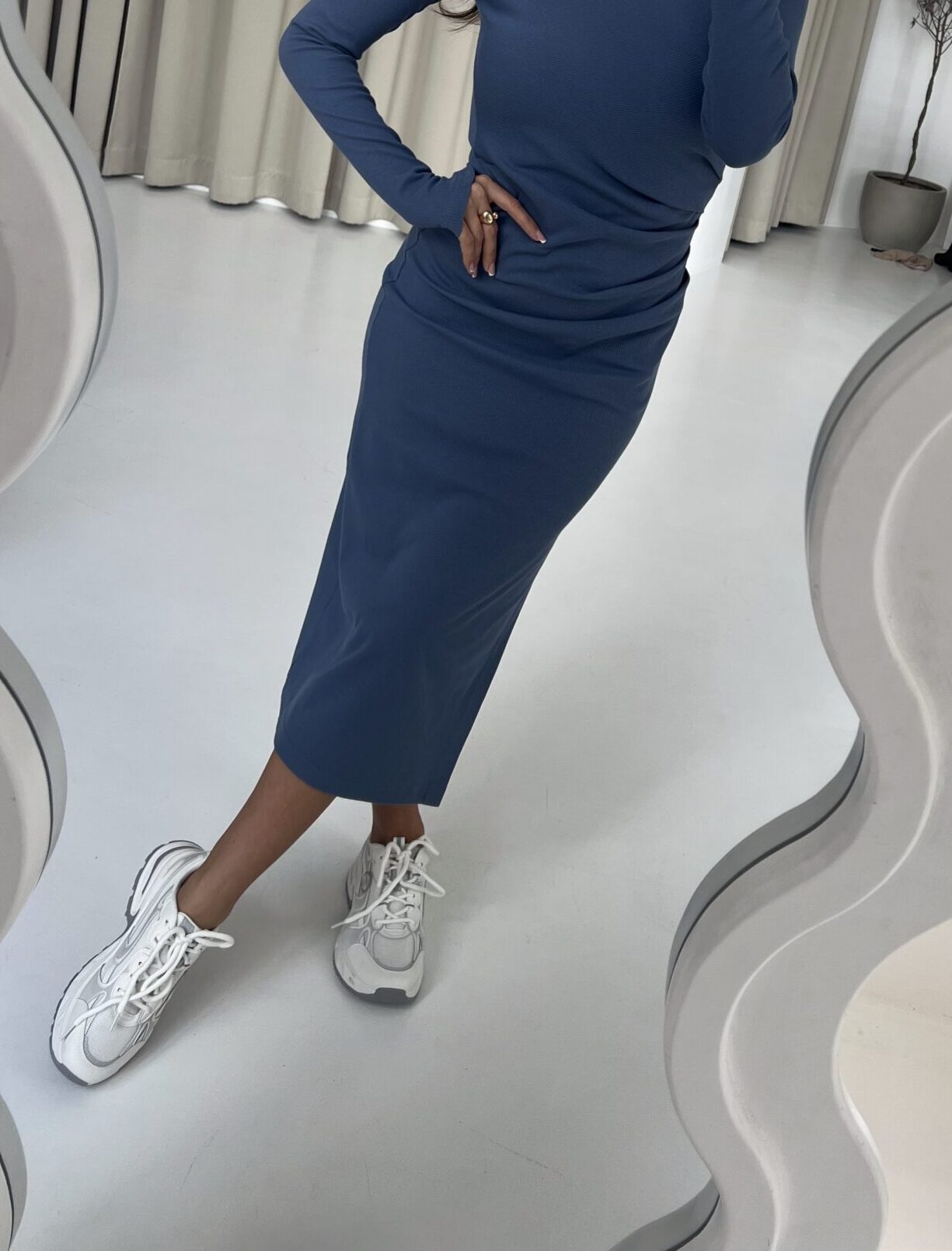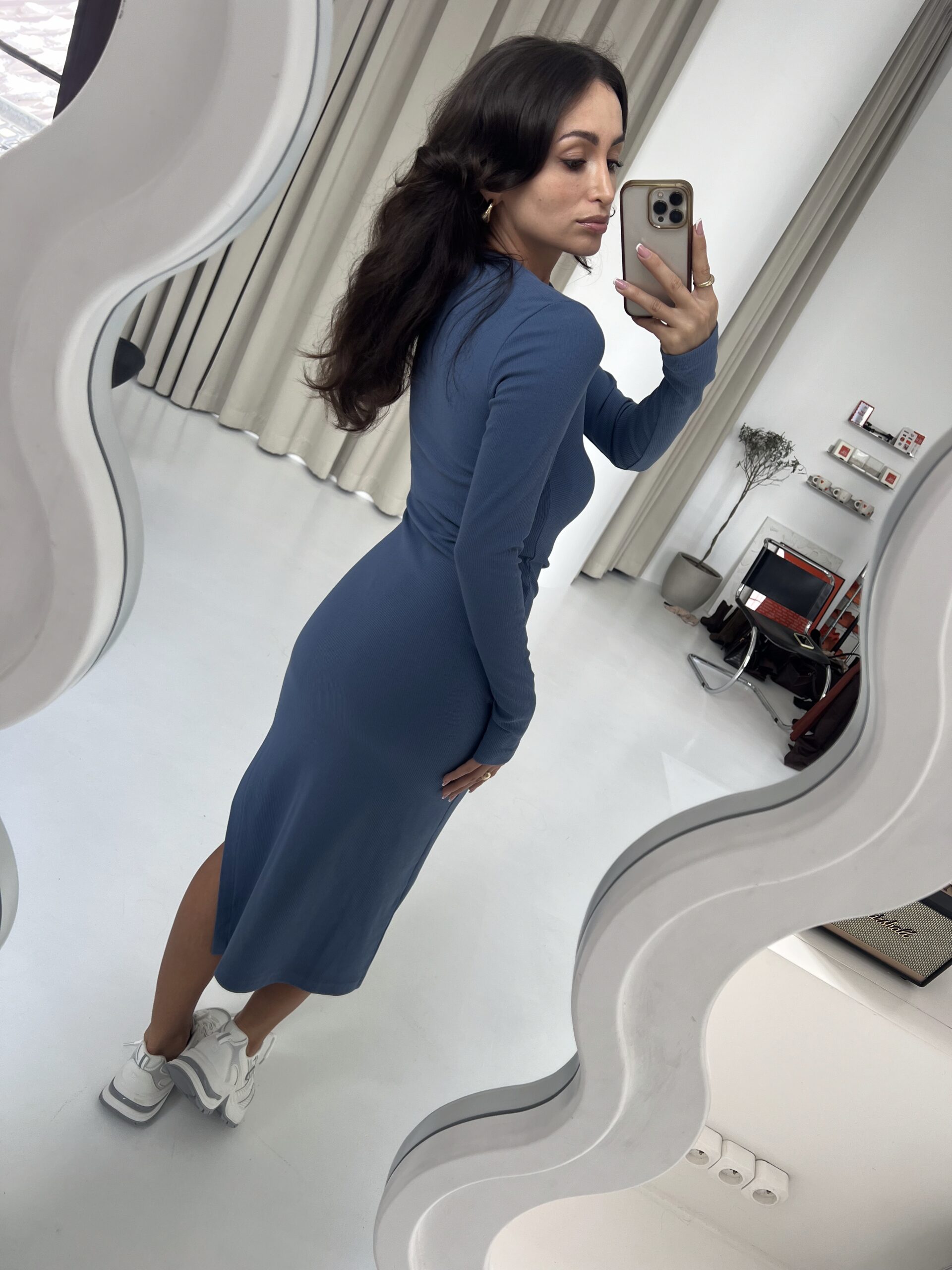 Elegancka i wygodna sukienka wykonana z wysokiej jakości dzianiny na bazie bawełny z dodatkiem elastanu, który zapewnia idealne dopasowanie do sylwetki oraz komfort noszenia przez cały dzień. Model o długości za kolano subtelnie podkreśla figurę, a boczne rozcięcie dodaje lekkości i kobiecego charakteru. Zakładki w okolicy talii optycznie modelują sylwetkę, akcentując jej atuty. Klasyczny, okrągły dekolt pod szyję sprawia, że sukienka jest uniwersalna i ponadczasowa – doskonała zarówno na co dzień, jak i na bardziej formalne okazje. W modnym, zgaszonym odcieniu niebieskiego, który łatwo komponuje się z różnymi dodatkami. Idealna propozycja dla kobiet ceniących połączenie komfortu i elegancji.