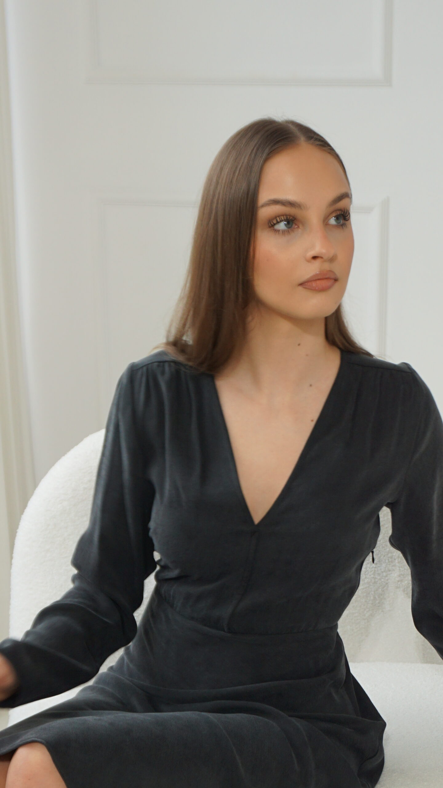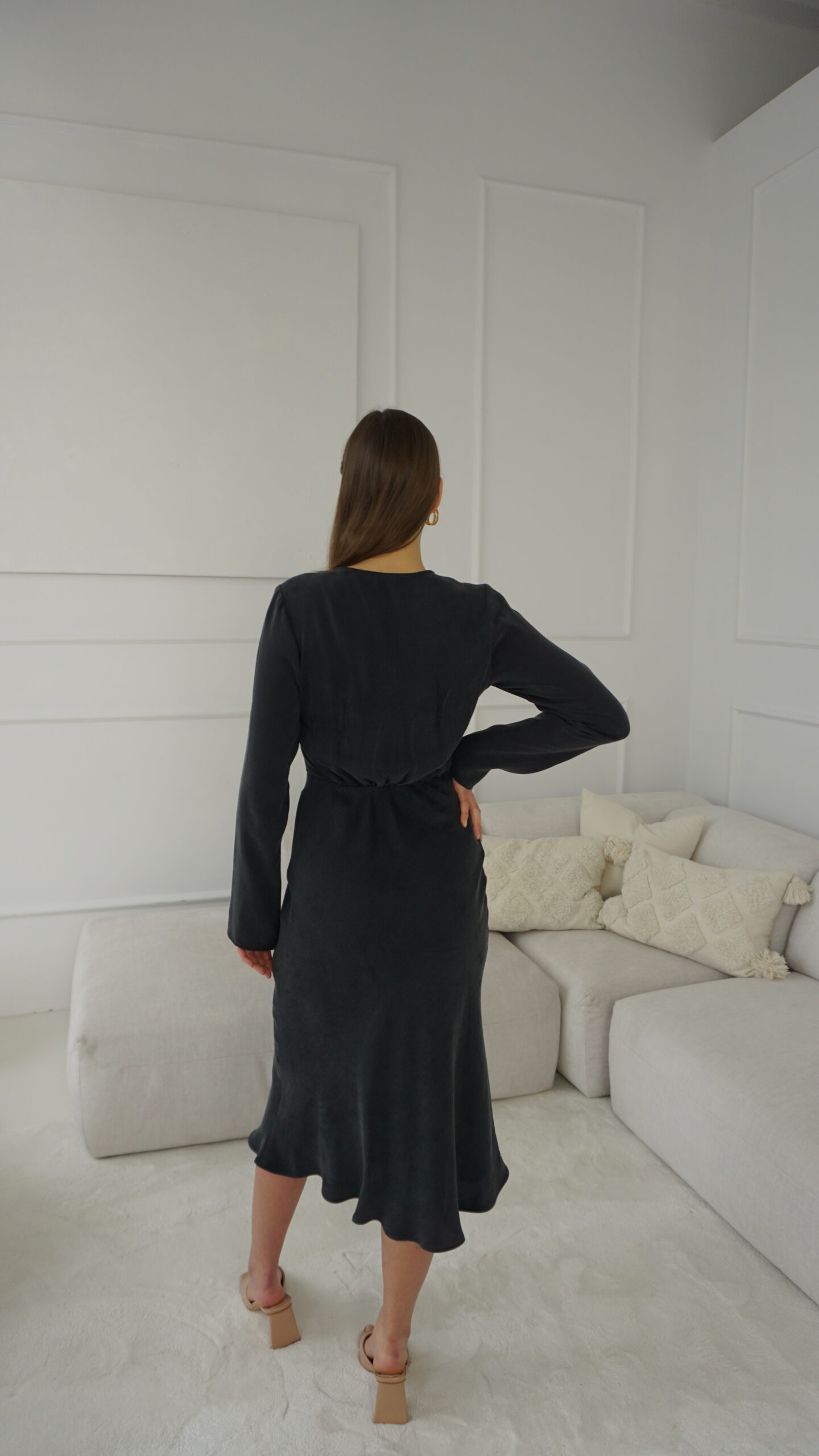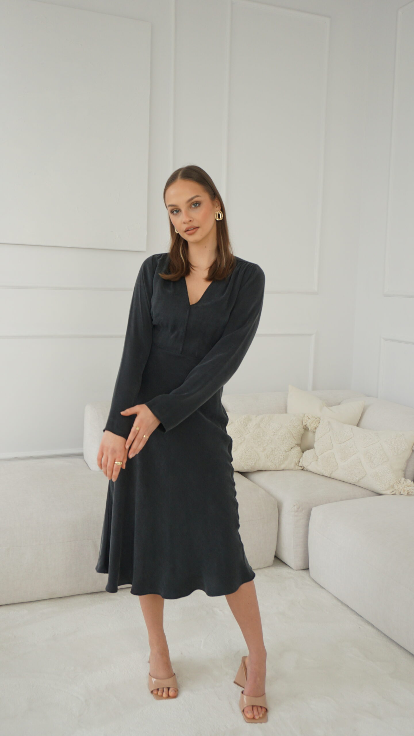 Sukienka GINA BLACK to doskonały model na uroczyste wyjścia jak i na co dzień. Część spódnicowa została uszyta ze skosu, co zapewnia piękne układanie się tkaniny i  lepsze dopasowanie do sylwetki. Luźniejsza część górna posiada lekkie marszczenie w okolicy ramion i talii. Dekolt w kształcie litery V zakończony w miejscu, które gwarantuje bezpieczne noszenie. Długie, luźniejsze rękawy, które można delikatnie podwijać. Z tyłu wszyliśmy gumkę dla lepszej wygody i dopasowania. Gina Black została uszyta z mieszanki lyocellu i wiskozy. To mięsista tkanina z efektem „skin peach”. Wkładając szpilki i biżuterię stworzysz stylizację na większe wyjścia, z kowbojkami i skórzaną kurtką idealną na wiosenne codzienne outfity.