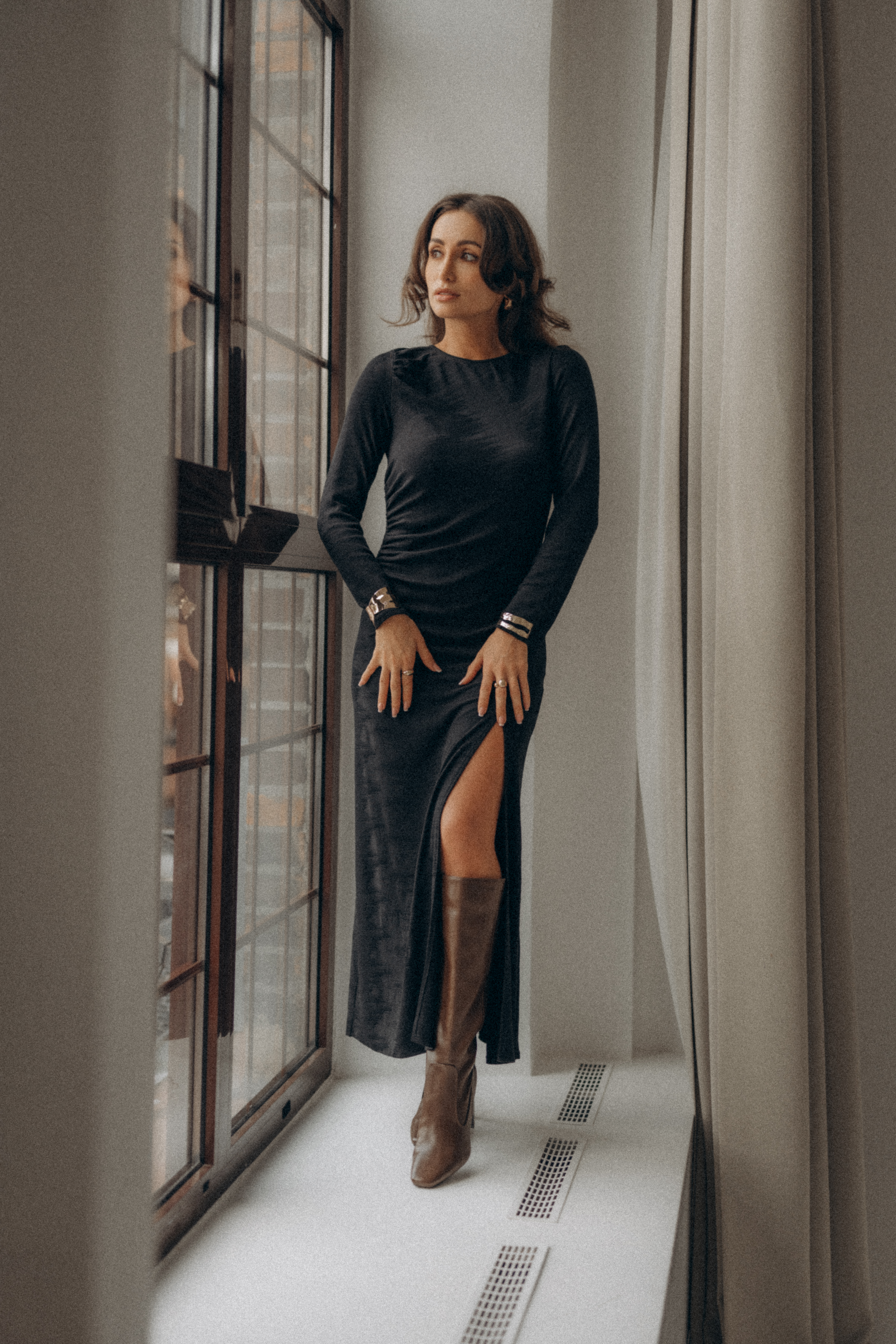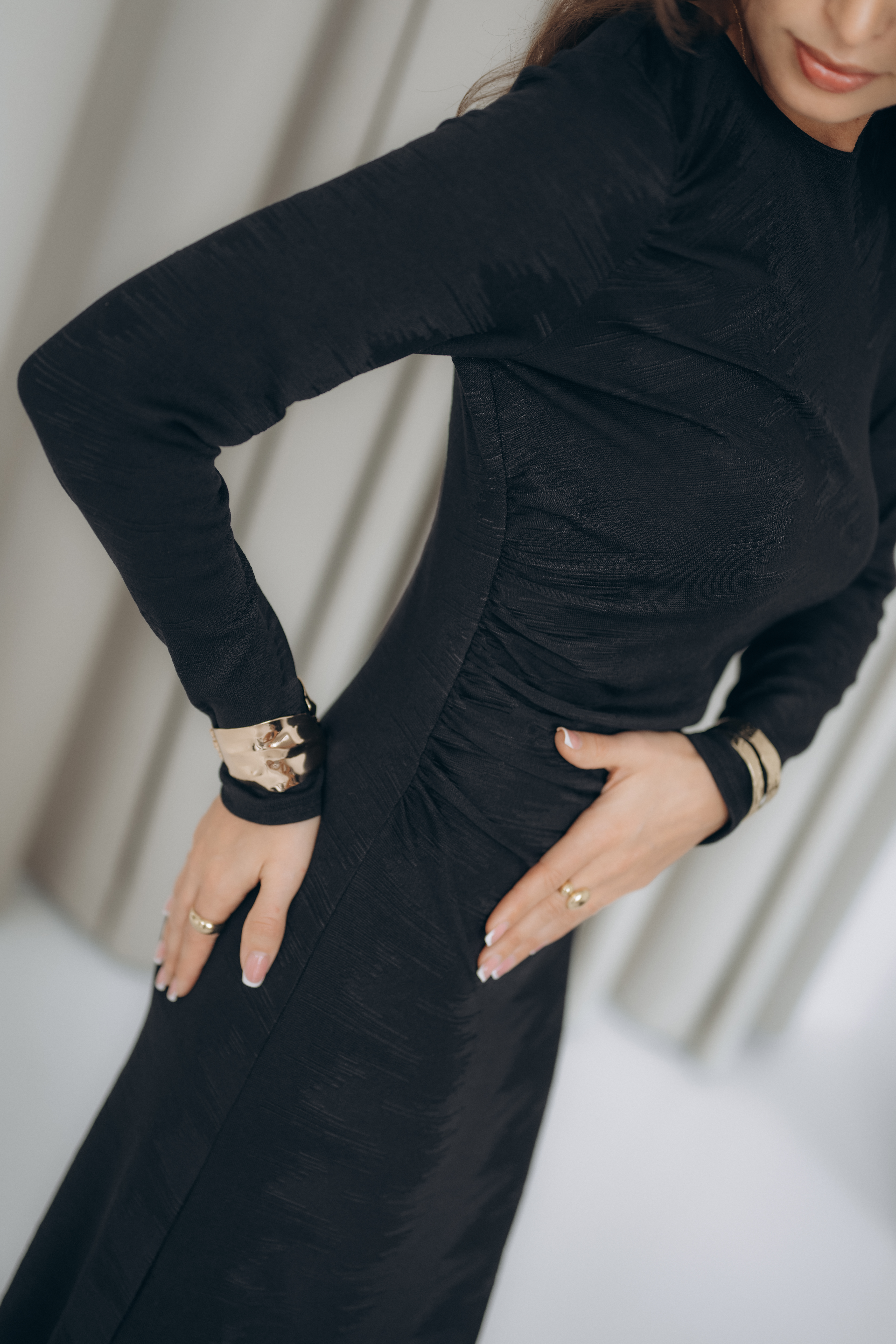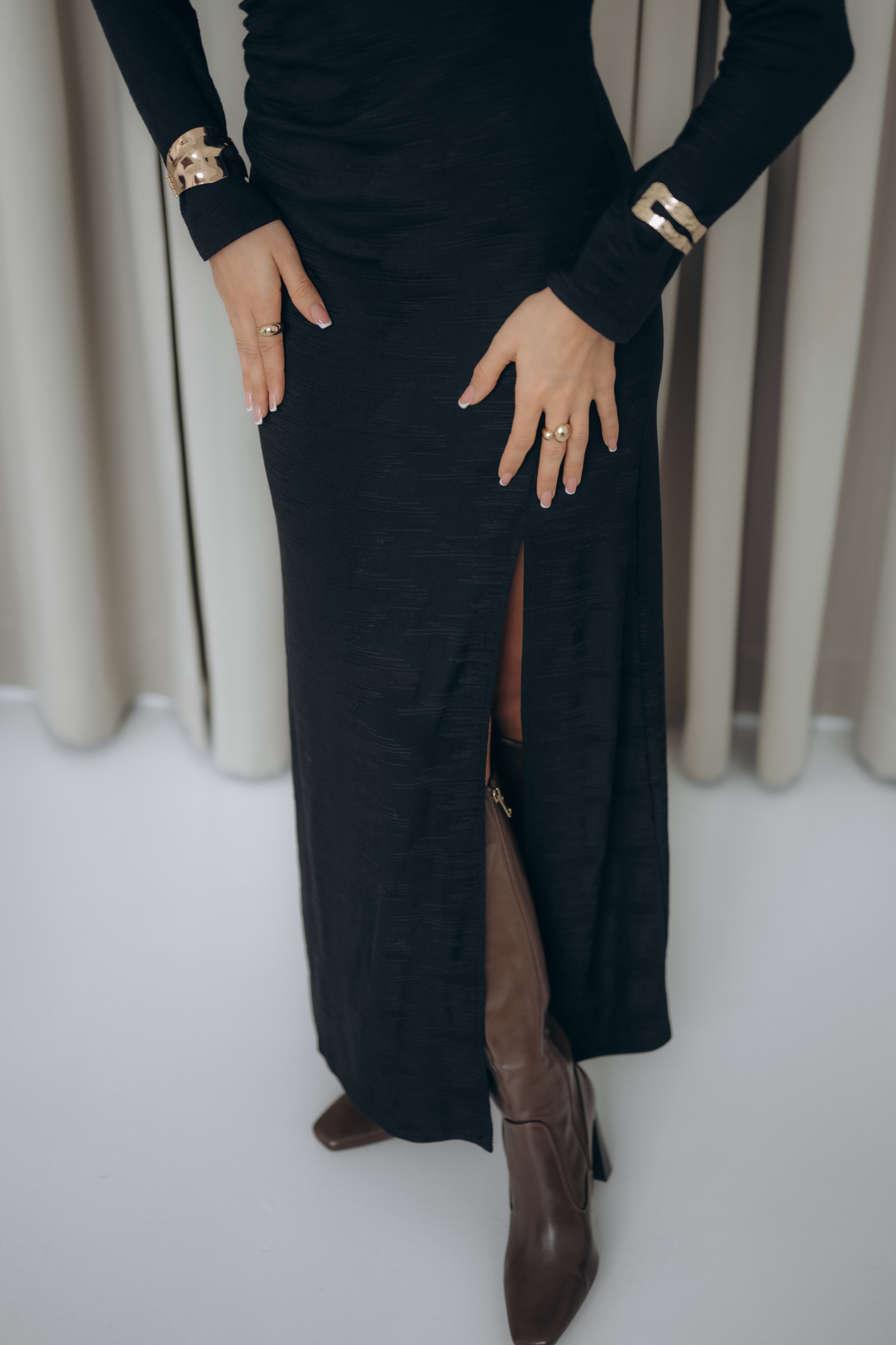Model o długości maxi z efektownym rozcięciem na prawej nodze, które dodaje lekkości i kobiecej swobody ruchu. Delikatne marszczenia przy ramieniu oraz w okolicy talii podkreślają figurę, tworząc naturalnie układającą się linię. Okrągły dekolt nadaje całości prostoty i ponadczasowej elegancji.