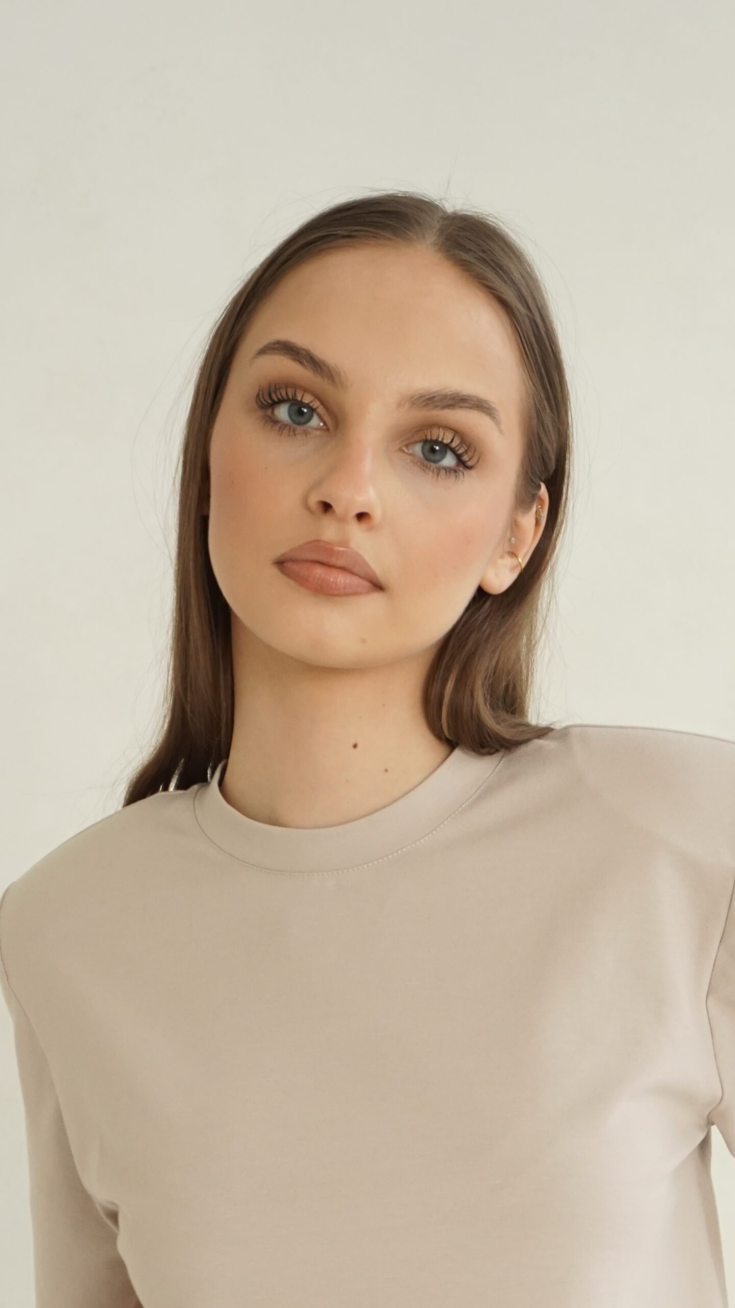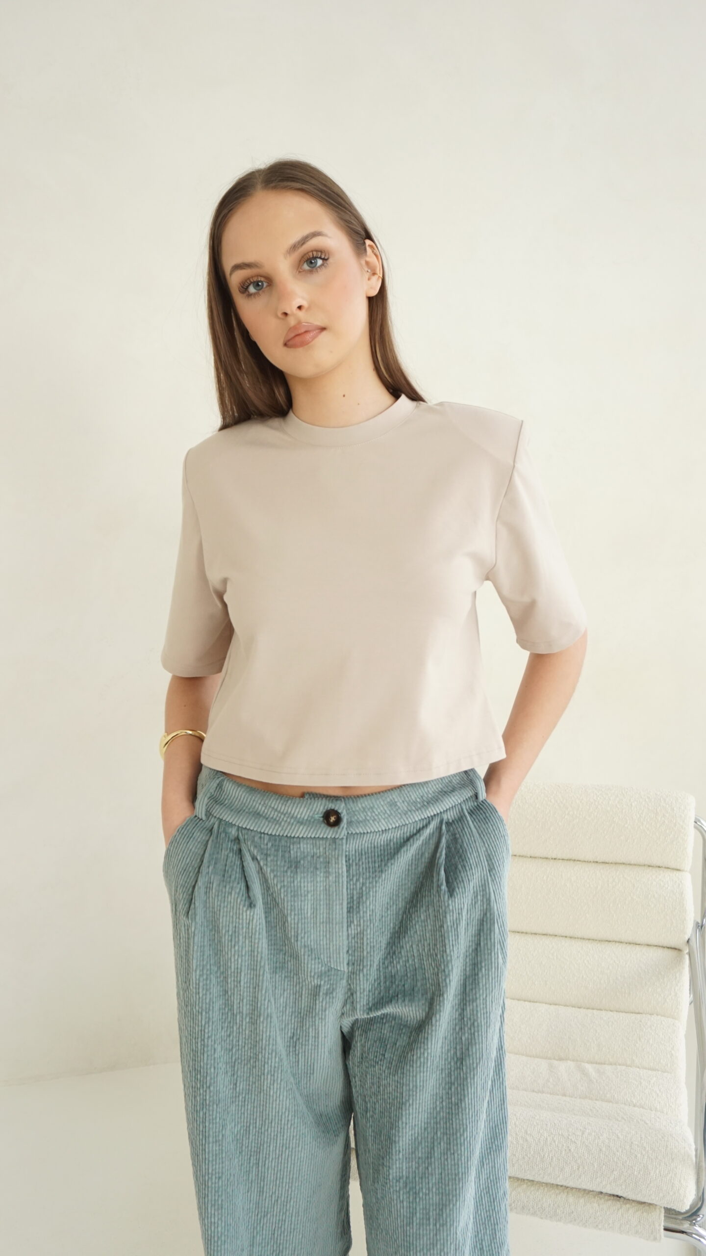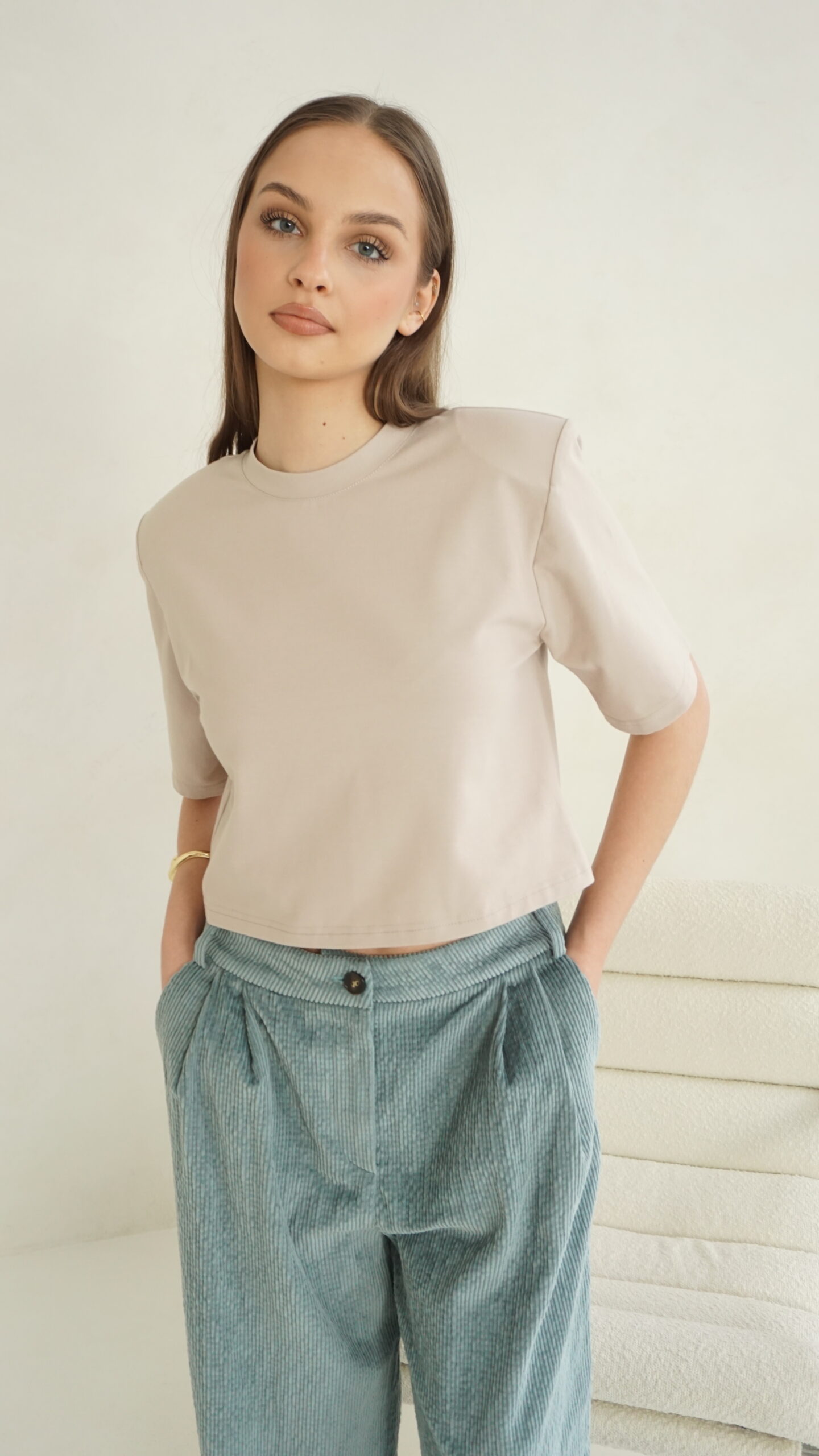 ROKSI Beige to krótki, bawełniany t-shirt, który możesz nosić praktycznie do wszystkiego. Wszyte poduszki w ramiona dodają designu i podkreślają sylwetkę. Pudełkowy fason i okrągły dekolt to uniwersalna baza każdej stylizacji.